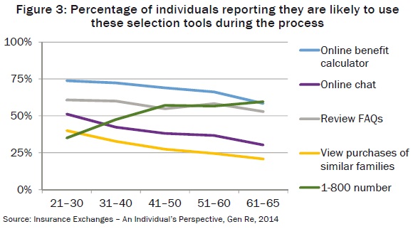 Whether an info-taker or info-seeker, the learning tools that support an exchange must address the specific needs of the consumer. We asked consumers of all ages what tools they would utilise as part of the education process before buying on an exchange. As you can see in the chart (Figure 3), the type of tool used is almost exclusively dependent on the age of the consumer. The older the consumer, the more the use of self-help tools decline while the need for human interaction increases.