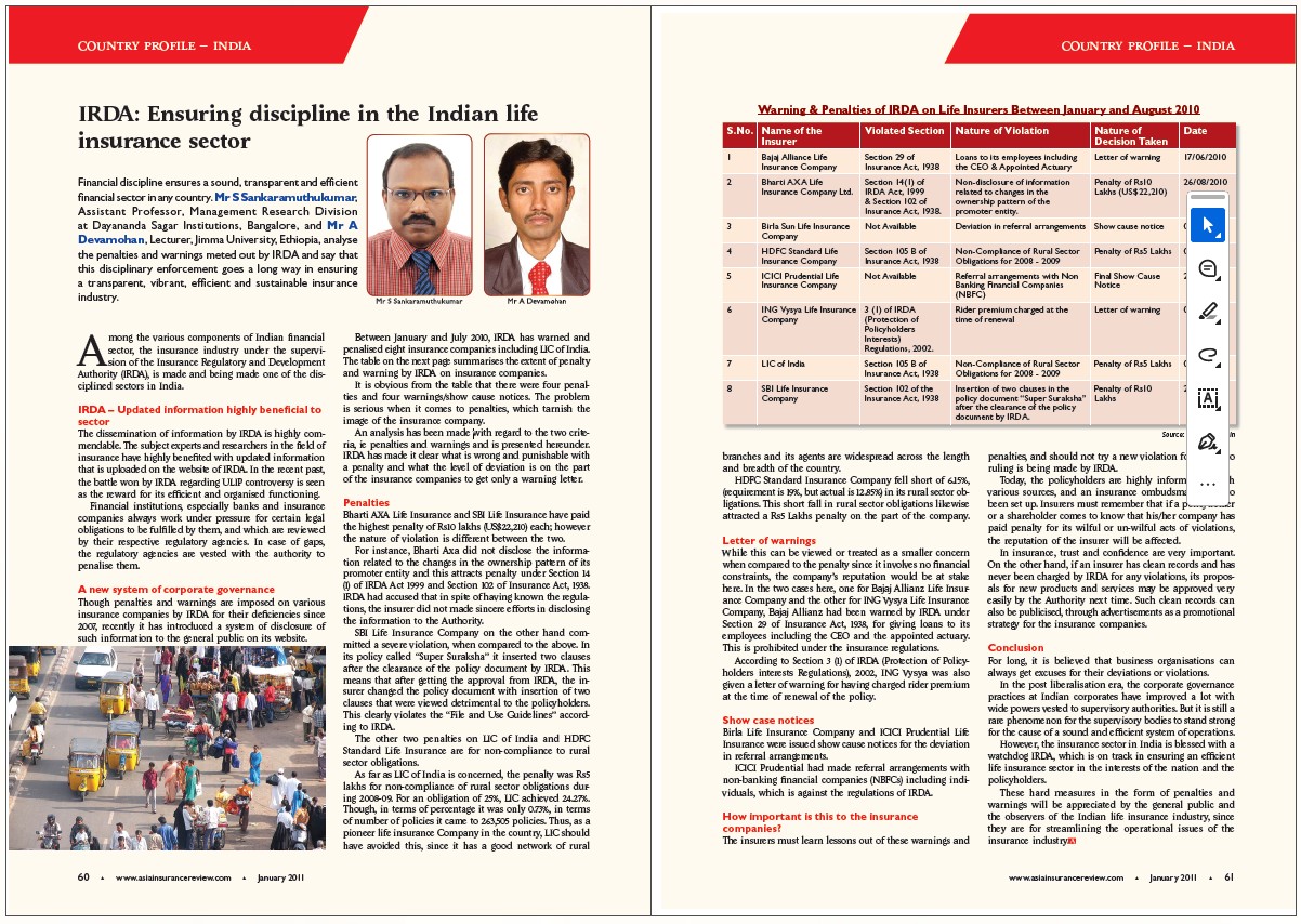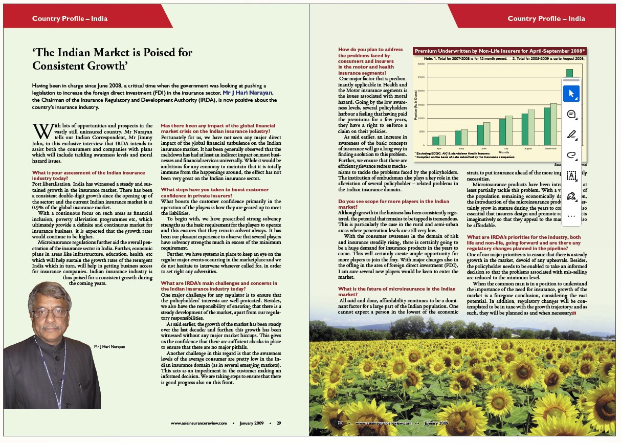 In January 2009, Asia Insurance Review spoke with the IRDA Chairman at the time, J Hari Narayan, who said that fortunately for the insurance market in India then, it was spared largely from the economic upheaval.