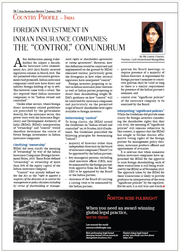 Unlike other sectors, where foreign direct investment guidelines are prescribed directly by the government, for the insurance sector this power vests with IRDA, now having changed its name to Insurance Regulatory and Development Authority of India (IRDAI), and its interpretation of “ownership” and “control” determines the course of future foreign investments in Indian insurance companies.