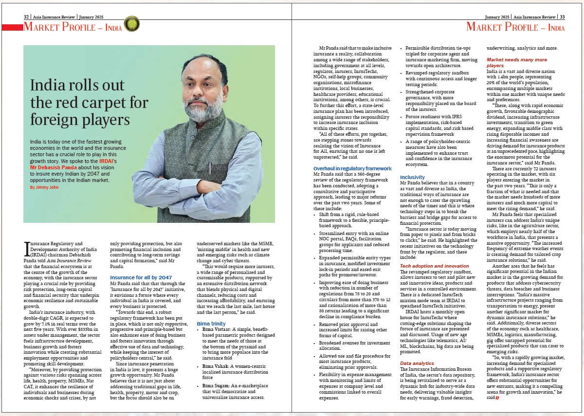 In the 2025 edition of the annual India Rendezvous, Asia Insurance Review interviewed then-Chairman Debashish Panda, who said that through the “Insurance for All” by 2047 initiative, the vision is a future where every individual in India is covered, and every business is protected by insurance.