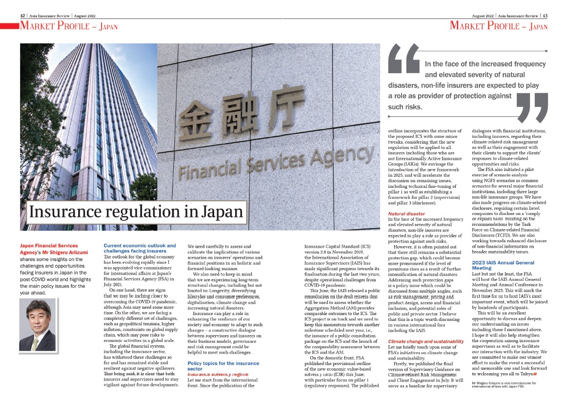One of the most recent articles on the Japanese regulatory market, our August 2022 issue had FSA’s Mr Shigeru Ariizumi share some insights on the challenges and opportunities facing insurers in Japan post-pandemic and highlight the main policy issues for the year ahead.
