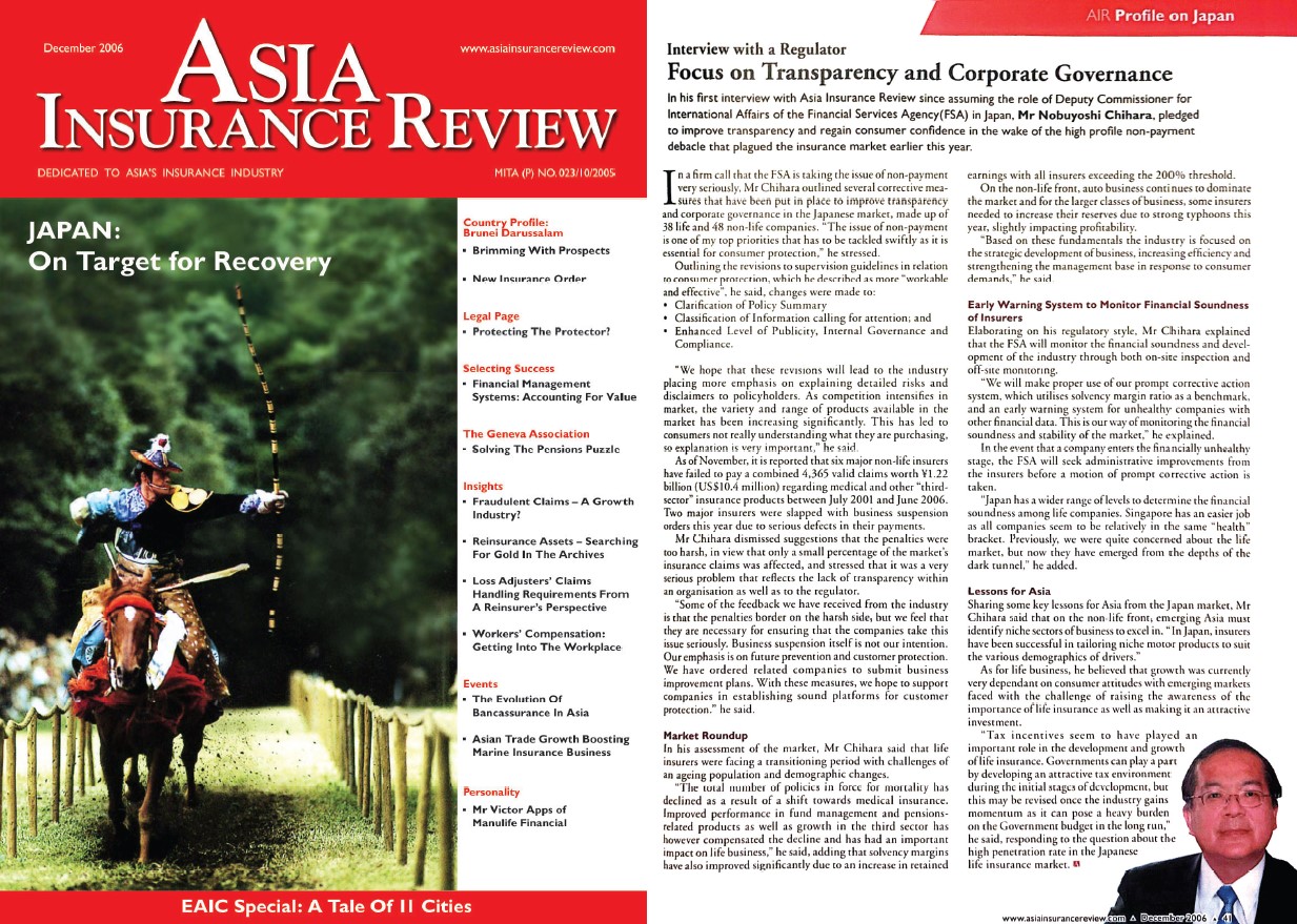 In 2006, FSA Japan Deputy Commissioner for International Affairs Mr Nobuyoshi Chihara gave his first interview with Asia Insurance Review since assuming his role. He outlined several corrective measures that have been put in place to improve transparency and corporate governance in the Japanese market. At that time, the market was made up of 38 life and 48 non-life companies. Now, in 2026, the market has 41 life and 57 non-life companies.