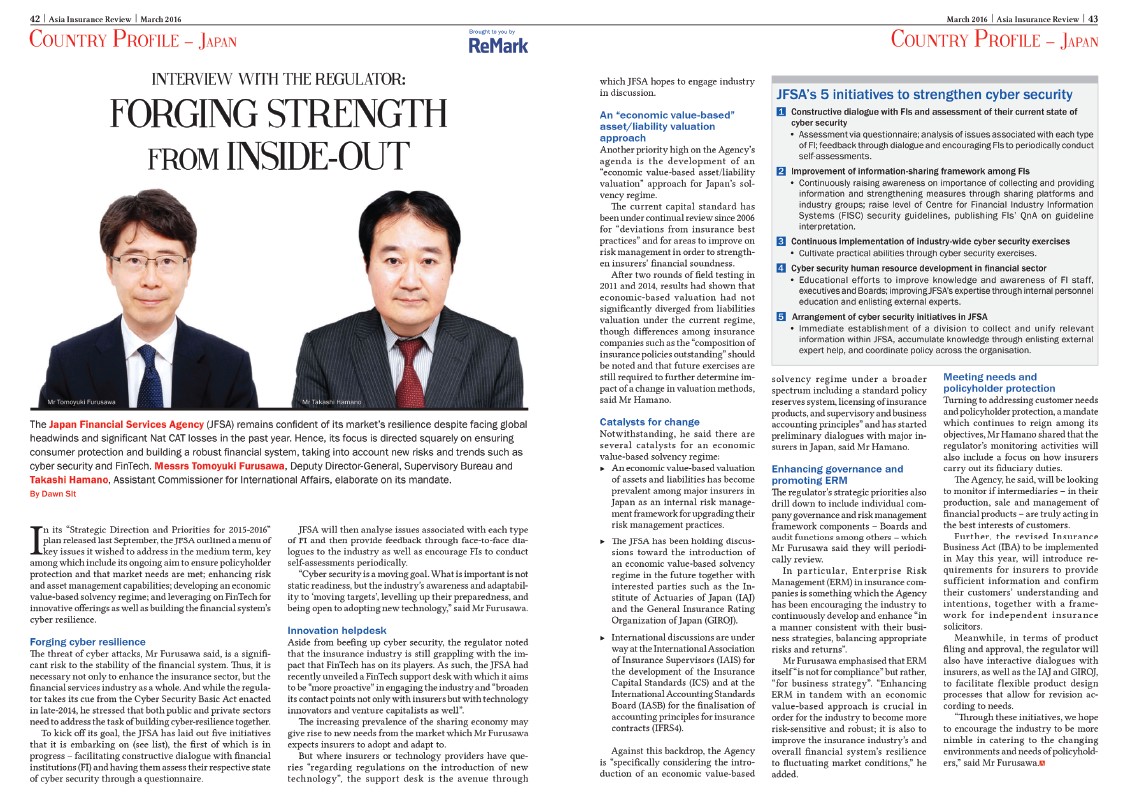 3 years later in our March 2016 issue, we interviewed JFSA’s Messrs Tomoyuki Furusawa and Takashi Hamano on how the FSA remained confident in the market’s resilience despite global headwinds and Nat CAT losses, while focussing on consumer protection and strengthening the financial system amid emerging risks such as cybersecurity and FinTech.