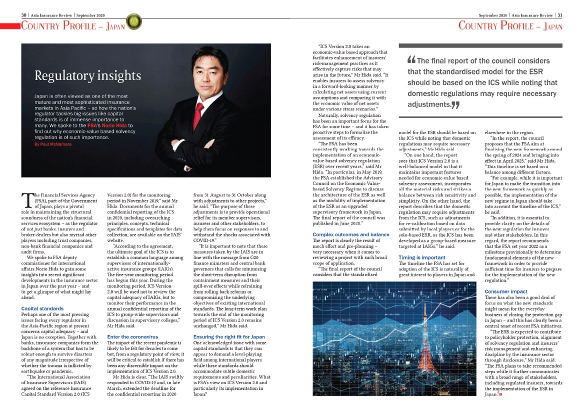 In September 2020, our ex-editorial director Mr Paul McNamara sat down with FSA’s Norio Hida to discuss why economic value-based solvency regulation is so important in one of Asia Pacific’s most mature and sophisticated insurance markets. Other regulatory insights were laid out too.