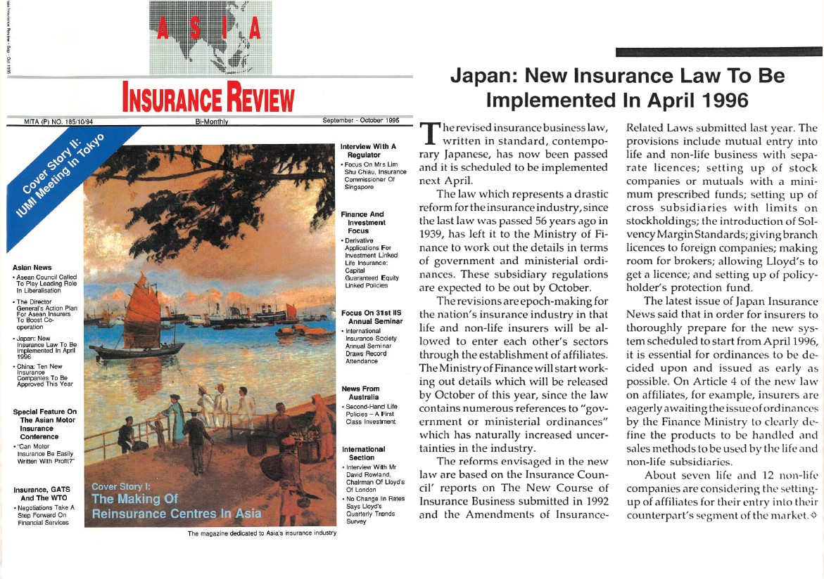 In September 1995, Asia Insurance Review briefly covered the news.