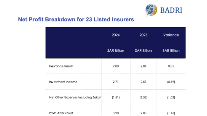 The Saudi insurance industry's profits (after zakat & tax) declined significantly by 36% year-on-year to SAR2.0bn ($533m) in 2025 from SAR3.2bn in 2024, according to BADRI Management Consultancy, an international actuarial and risk management consulting firm.
