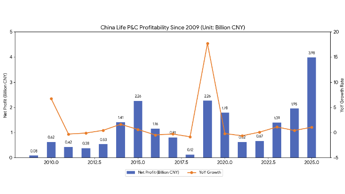 China Life Property & Casualty Insurance has maintained profitability since reporting its first profits in 2009, reaching a record high of CNY3.98bn ($580m) in 2025.
